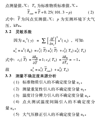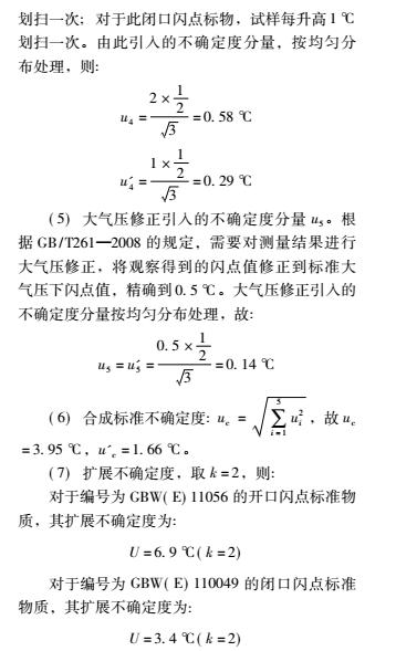 通過評定可得,開口 / 閉口閃點測定儀的不確定度主要來源于標準物質(zhì)、重復(fù)性測量及點火測溫間隔引入的不確定度,溫度計顯示和大氣壓修正引入的標準不確定度較小。